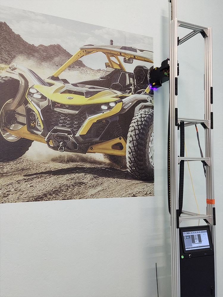 Druk ścienny polega na tym, że głowica nanosi tusz na ścianę lub inną powierzchnię pionową pasek po pasku. Drukujemy atramentem UV, a lampa UV na bieżąco utwardza ten tusz, dzięki czemu tusz trzyma się na dowolnej powierzchni pionowej i nie musi schnąć.